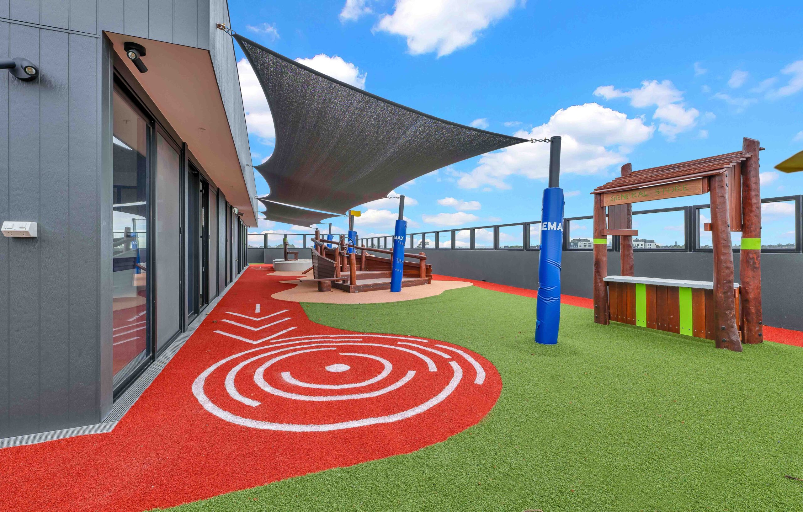 - Completed outdoor playground with Van Ryt custom play equipment, shade sails & secure outdoor storage