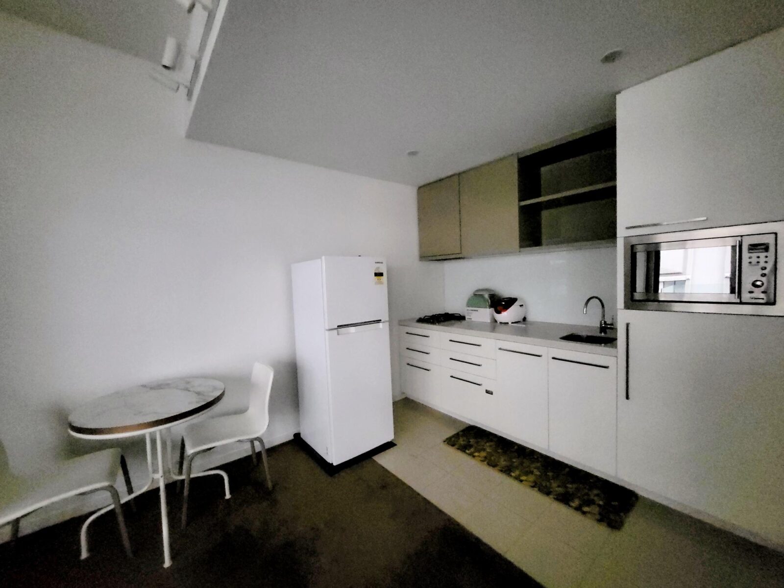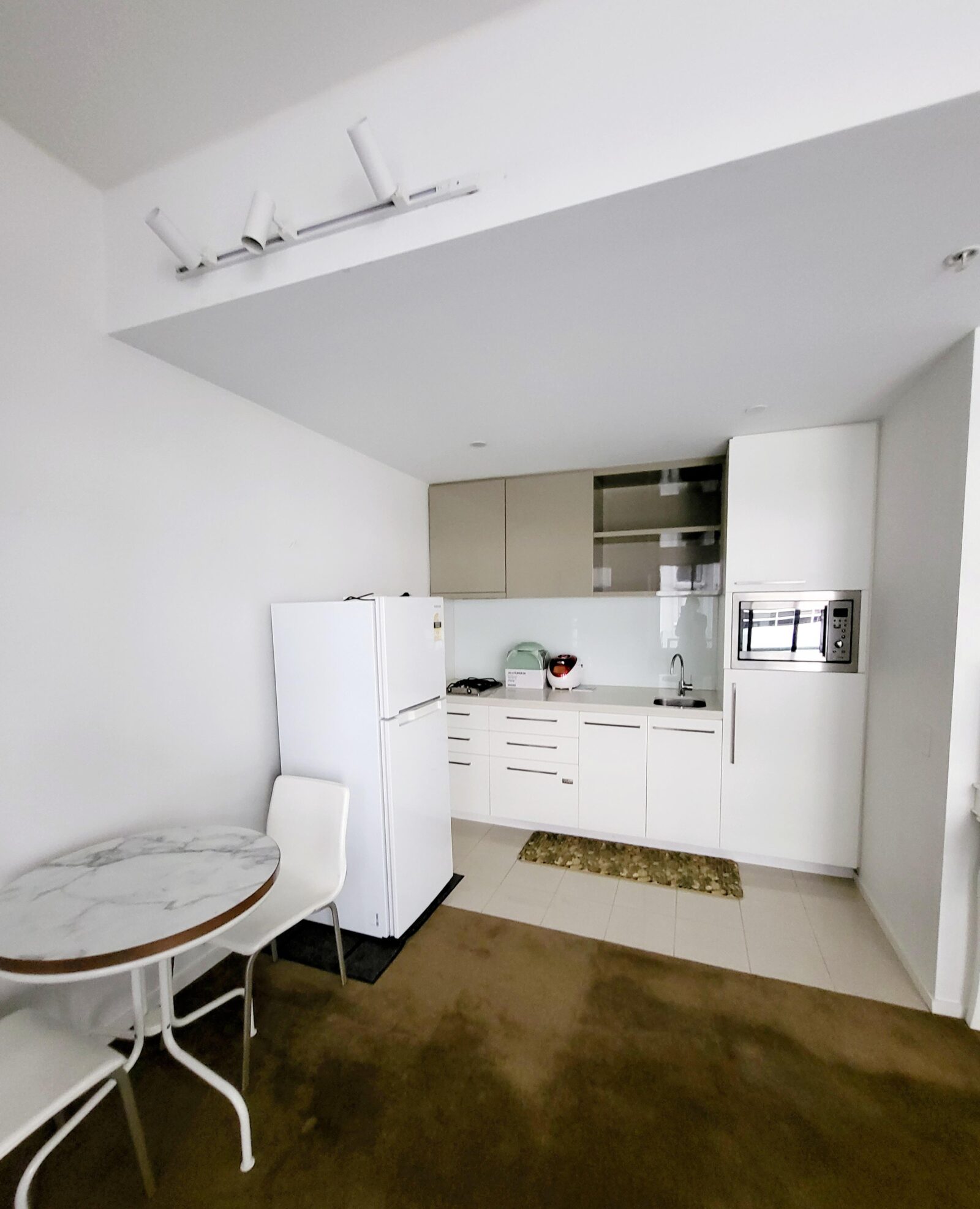 • Modern kitchen with stone benchtop, gas cooktop, microwave, and fridge